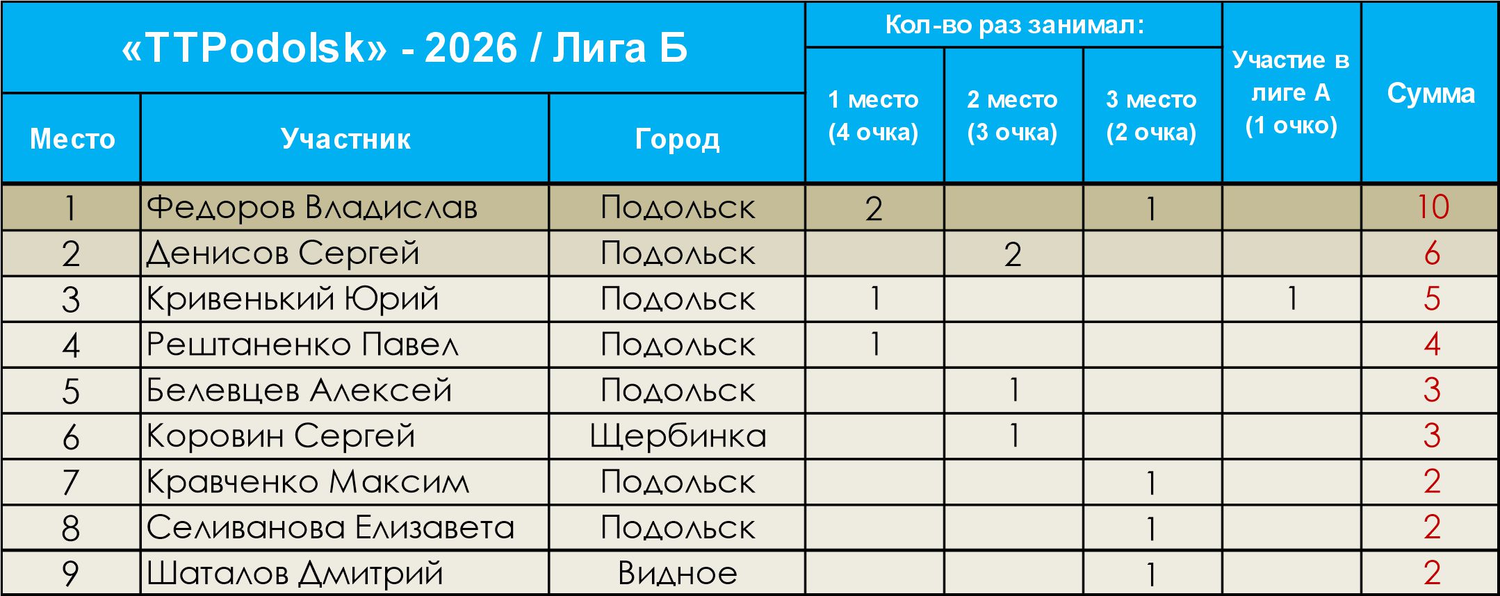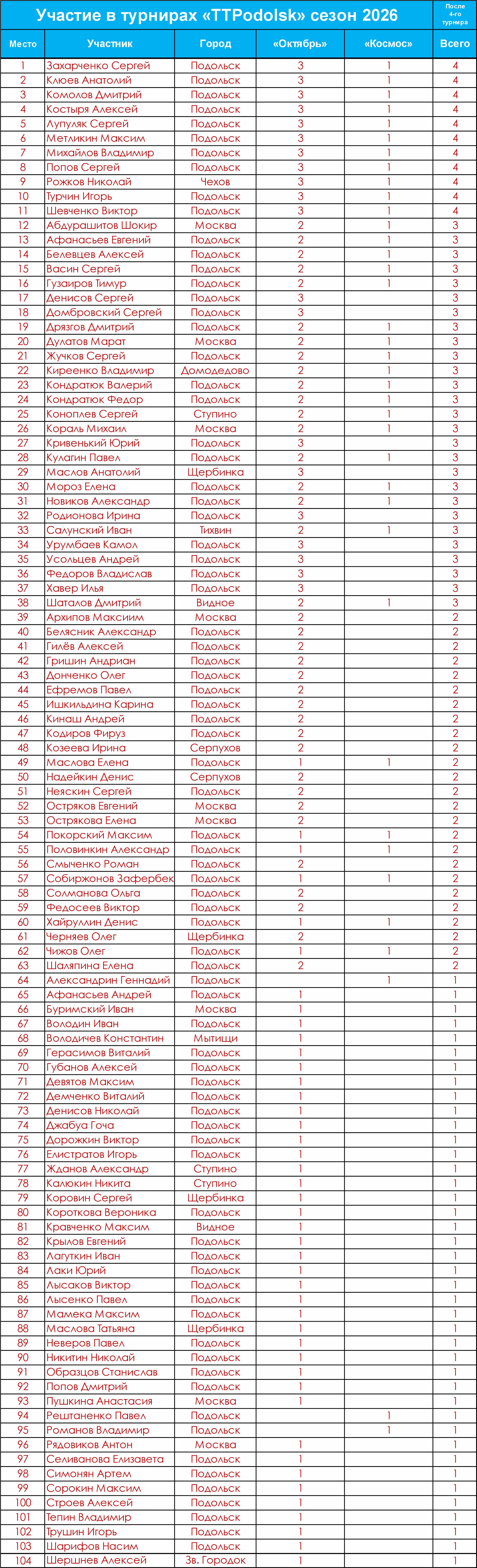 Статистика игр клуба по лигам.Общая статистика посещений турниров на 25 января 2026 г.